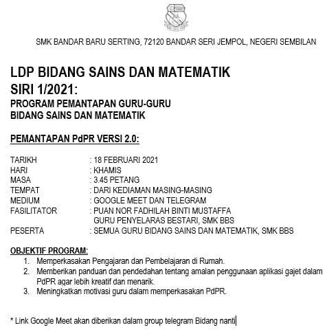 LATIHAN DALAM PERKHIDMATAN (LDP) BIDANG SAINS DAN MATEMATIK SMK BANDAR BARU SERTING SIRI 1 TAHUN 2021 - TAJUK "PEMANTAPAN PdPR VERSI 2.0" FASA PERINTAH KAWALAN PERGERAKAN (PKP)