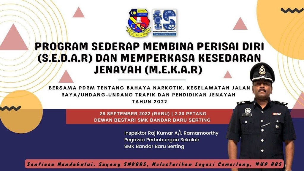 PROGRAM SEDERAP MEMBINA PERISAI DIRI (S.E.D.A.R) DAN MEMPERKASA KESEDARAN JENAYAH (M.E.K.A.R) BERSAMA PDRM TENTANG BAHAYA NARKOTIK, KESELAMATAN JALAN RAYA / UNDANG-UNDANG TRAFIK DAN PENDIDIKAN PENCEGAHAN JENAYAH